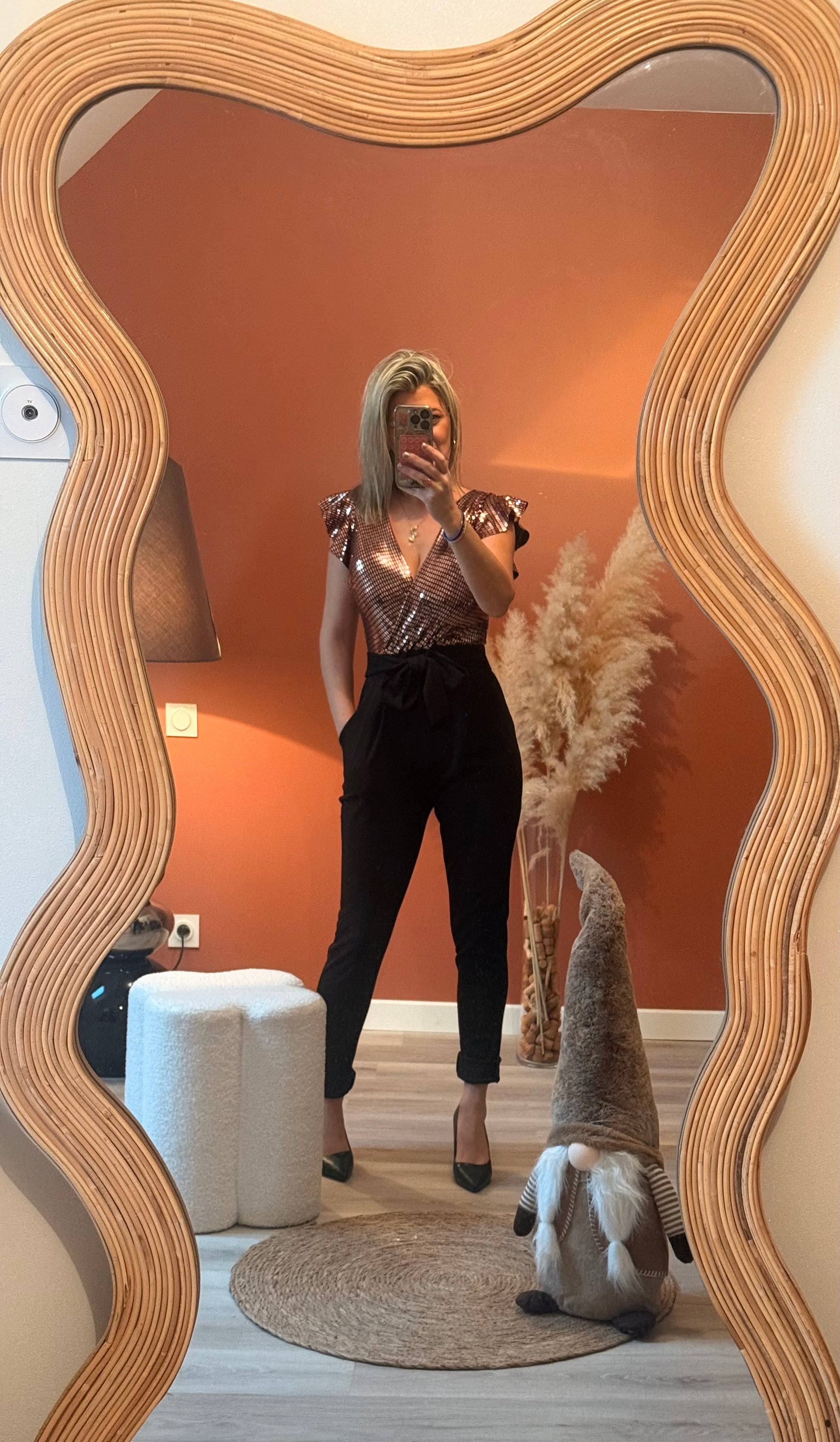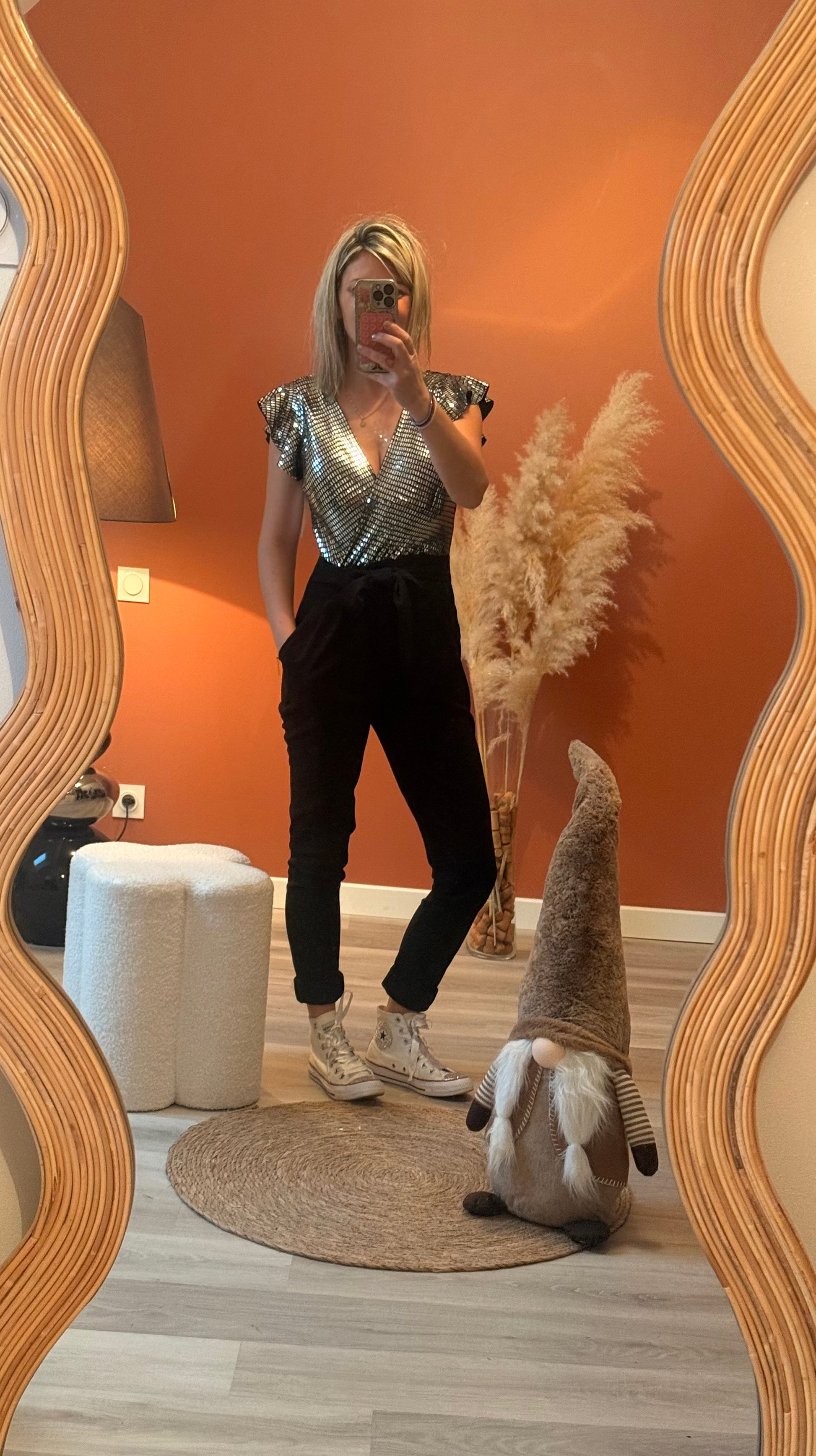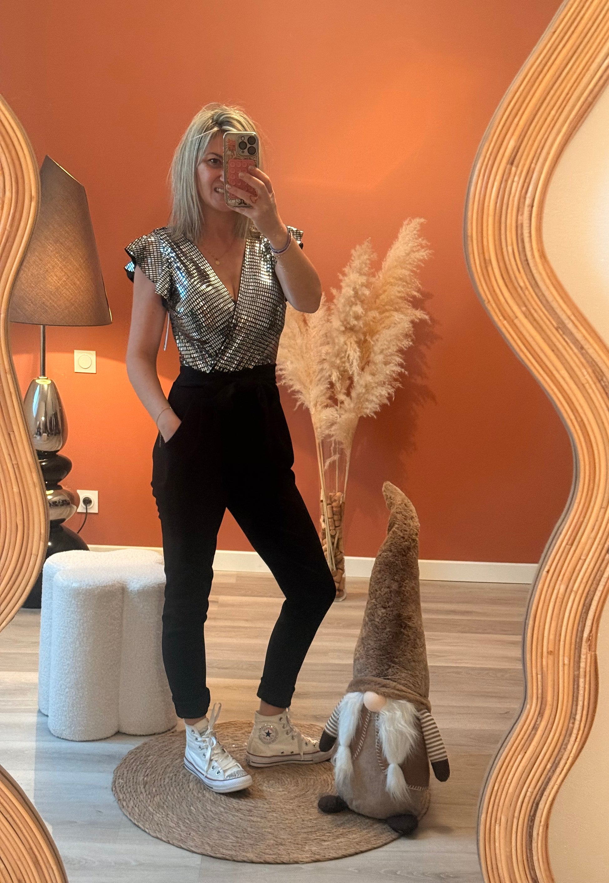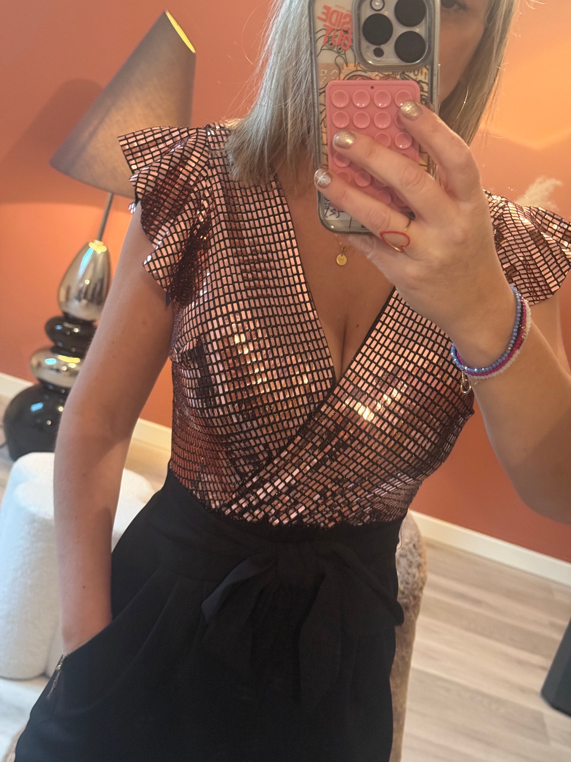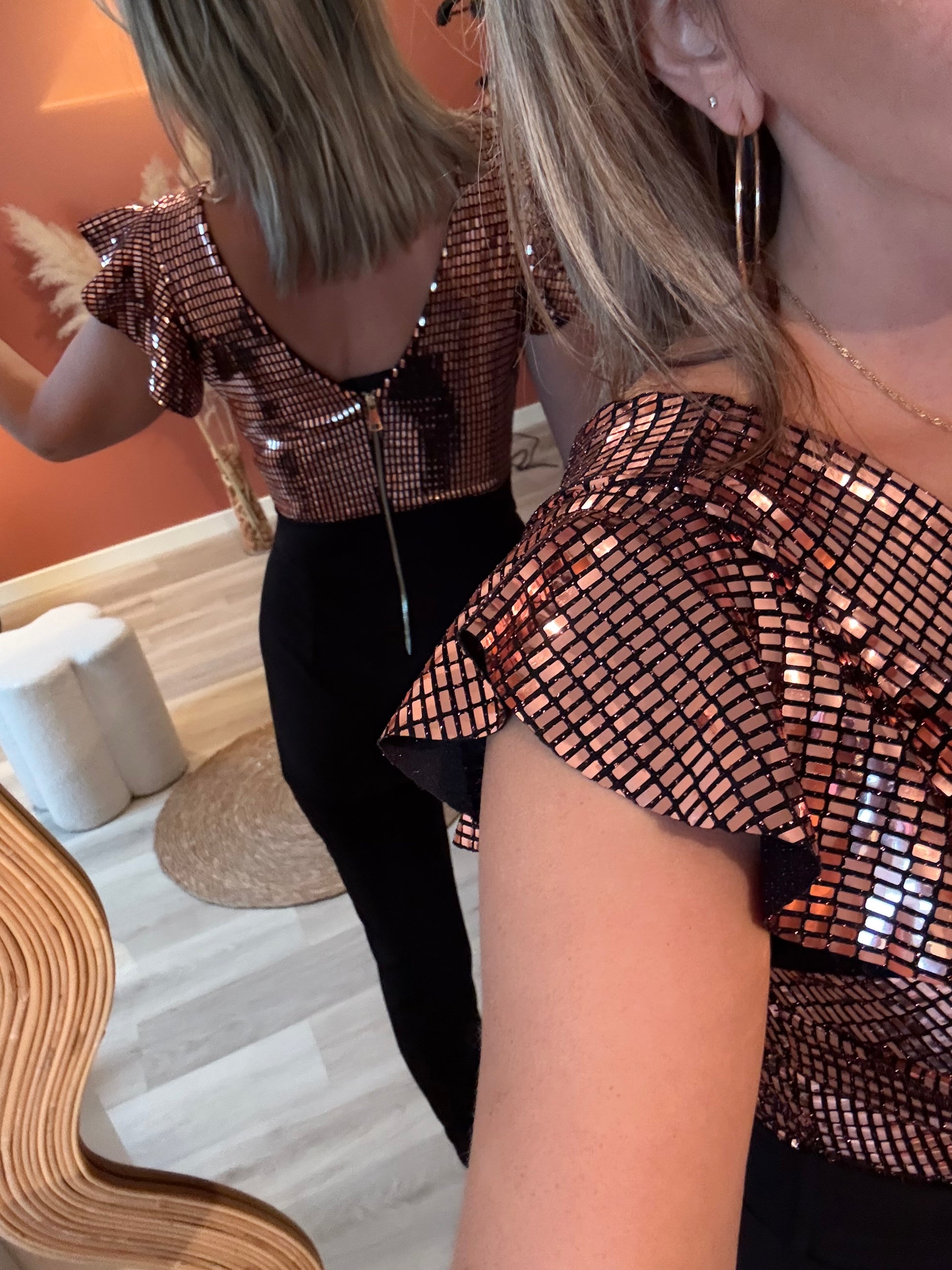 Combinaison chic composĂ©e dâun haut mĂ©tallisĂ© argentĂ© ou champagne Ă dĂ©colletĂ© cache-cĆur et manches volantĂ©es, associĂ©e Ă un pantalon noir fuselĂ© taille haute. Fermeture au dos et possĂšde une ceinture intĂ©grĂ©e, mettant la silhouette en valeur.