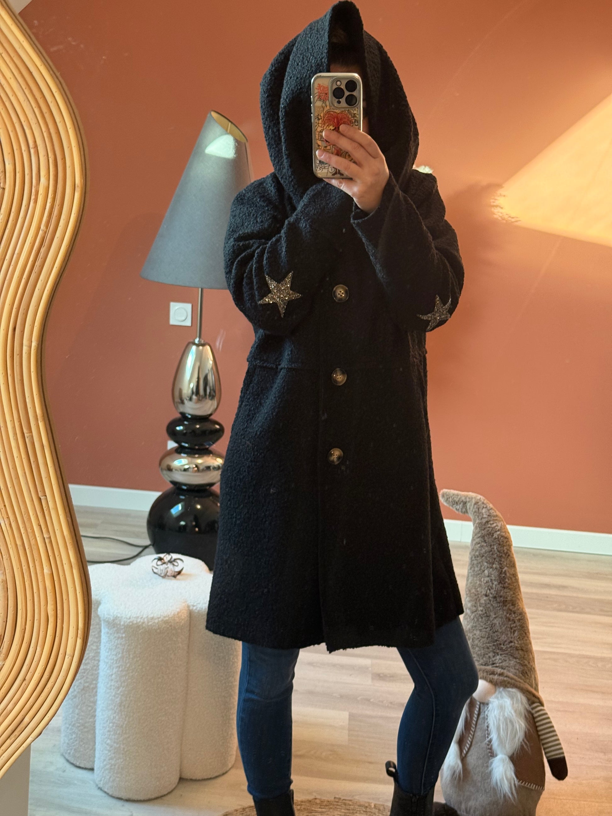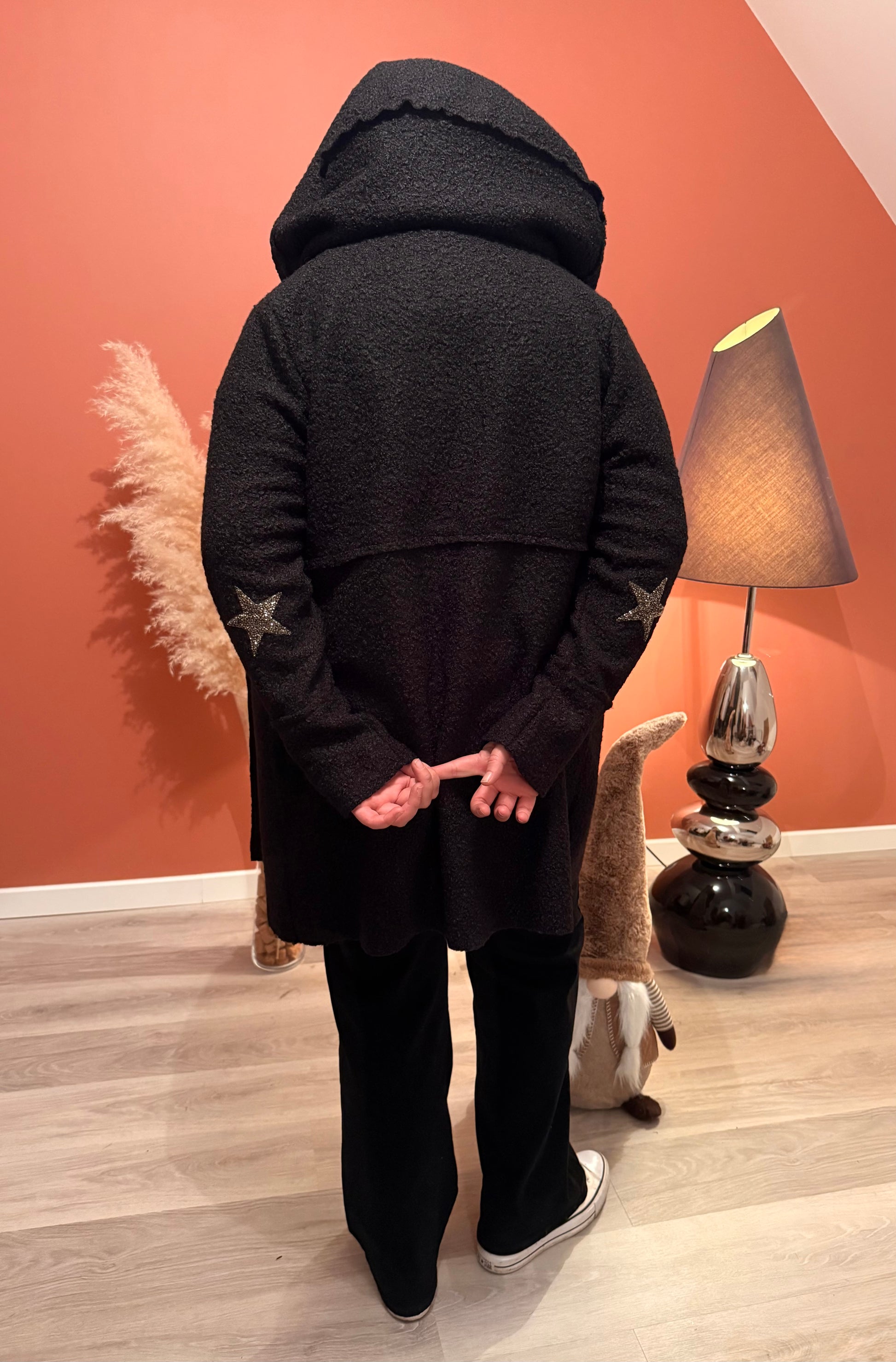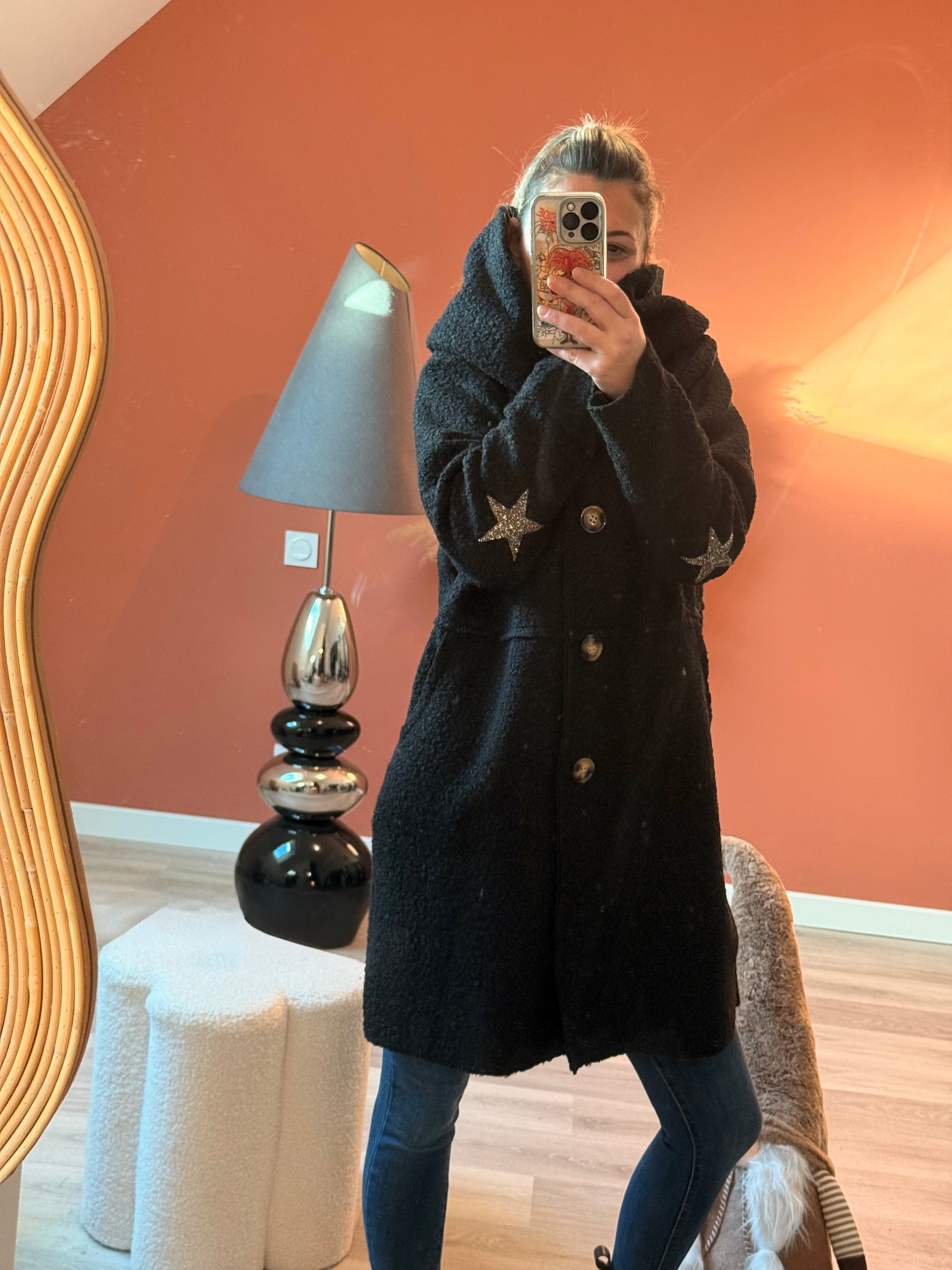 Manteau femme effet mouton, doux et chaud, idéal pour l’hiver. Fabrication italienne. Pièce tendance avec des étoiles ⭐️ sur les coudes!