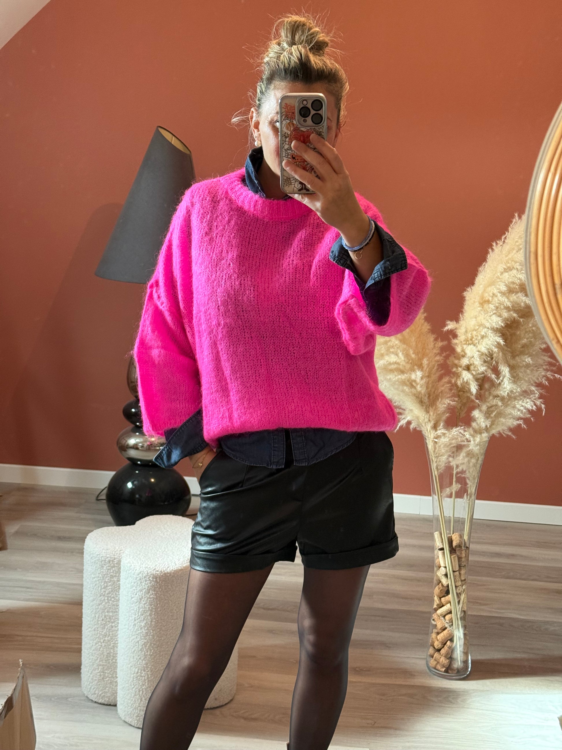 Enveloppez-vous de confort et de style avec notre pull en mohair tout doux, parfait pour affronter la saison avec pep’s et élégance. Son coloris fuchsia fluo apporte une touche lumineuse et tendance à vos tenues, tandis que sa maille légère et chaude le rend aussi agréable que stylé. Un véritable coup de cœur à porter aussi bien en look casual qu’habillé.