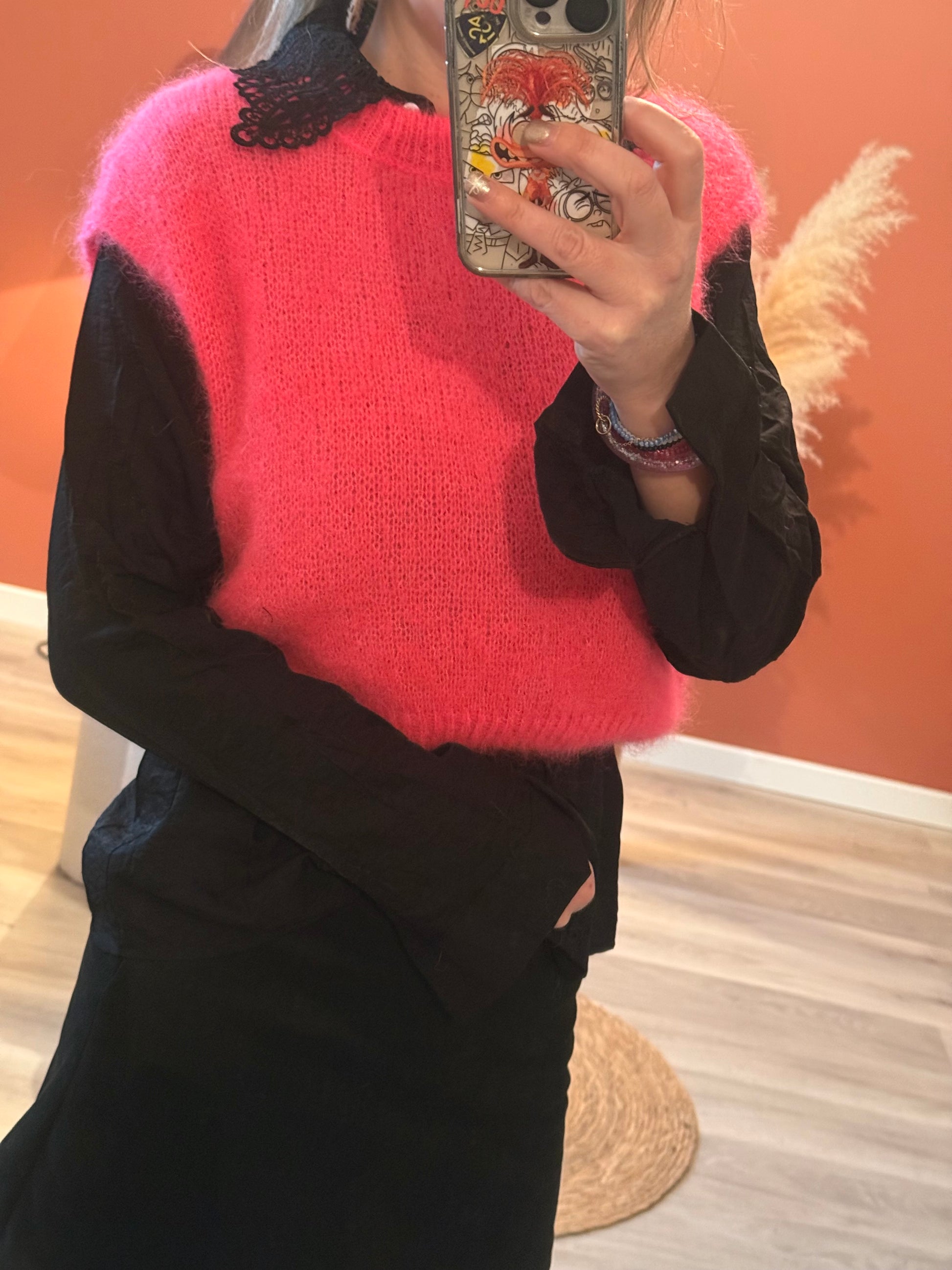 đEnveloppez-vous de confort et de style avec ce pull court sans manche en mohair tout doux, parfait pour affronter la saison avec pepâs et Ă©lĂ©gance. Son coloris fuchsia fluo apporte une touche lumineuse et tendance Ă vos tenues, tandis que sa maille lĂ©gĂšre et chaude le rend aussi agrĂ©able que stylĂ©. Un vĂ©ritable coup de cĆur Ă porter aussi bien en look casual quâhabillĂ©.