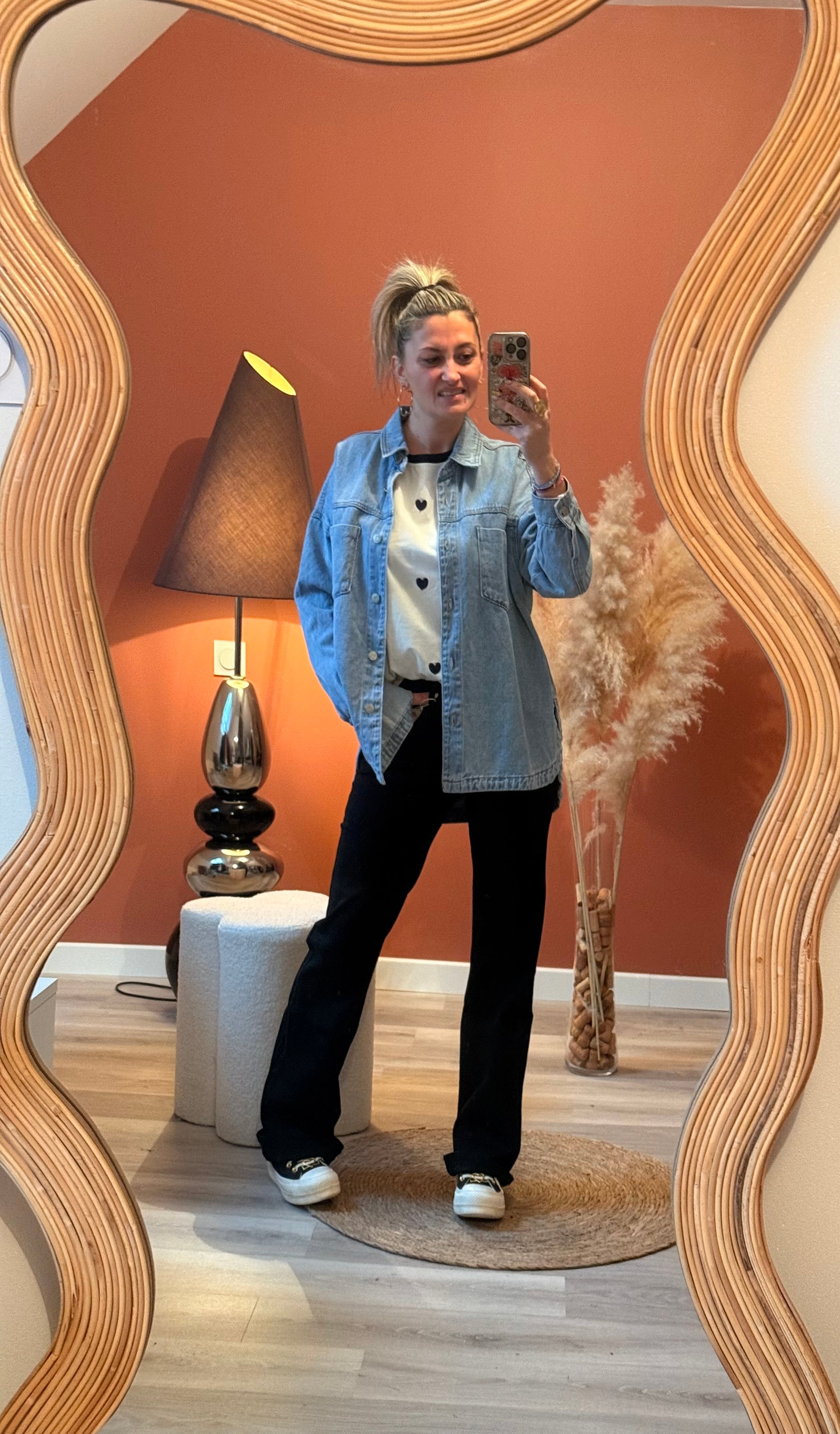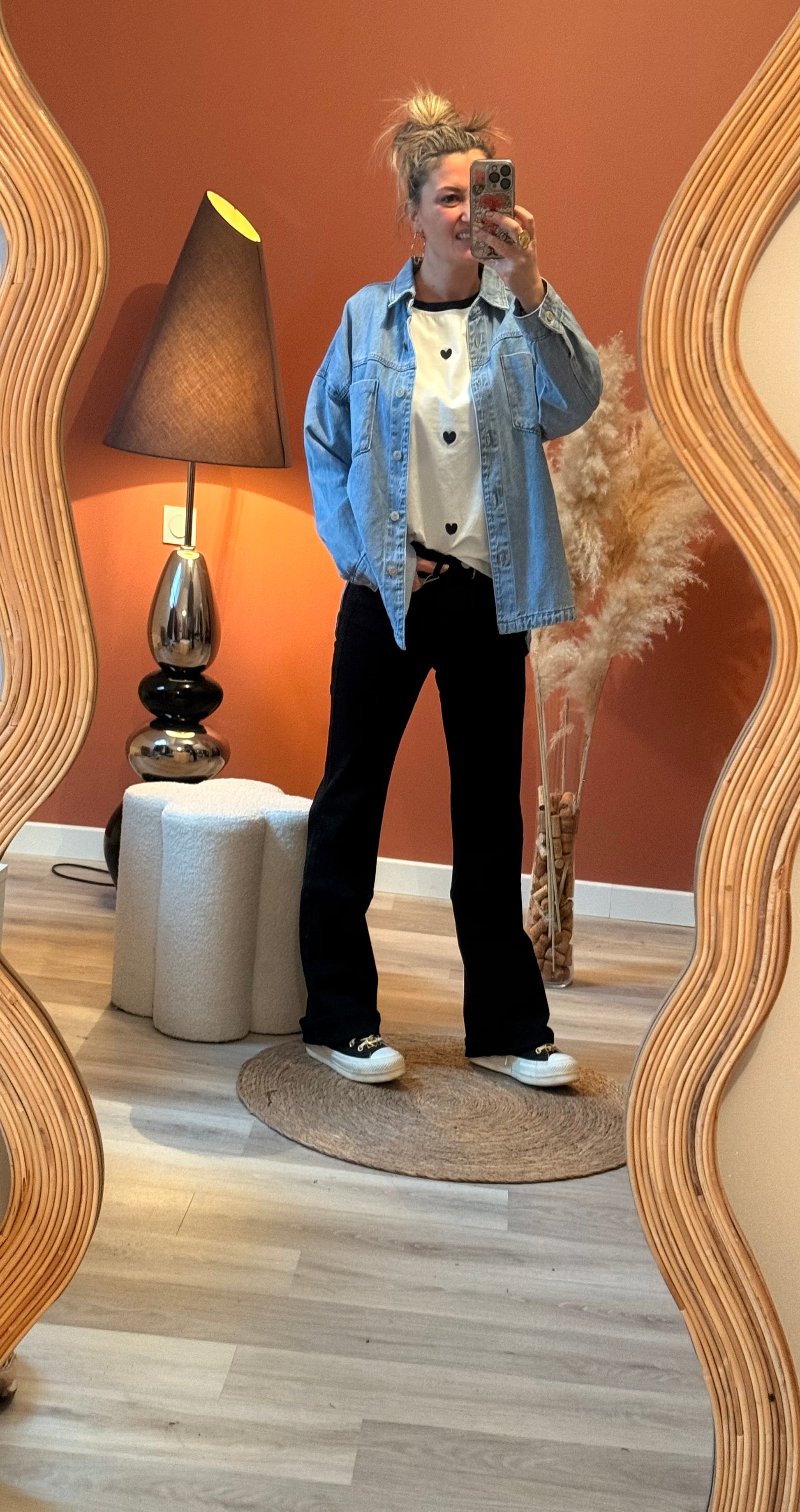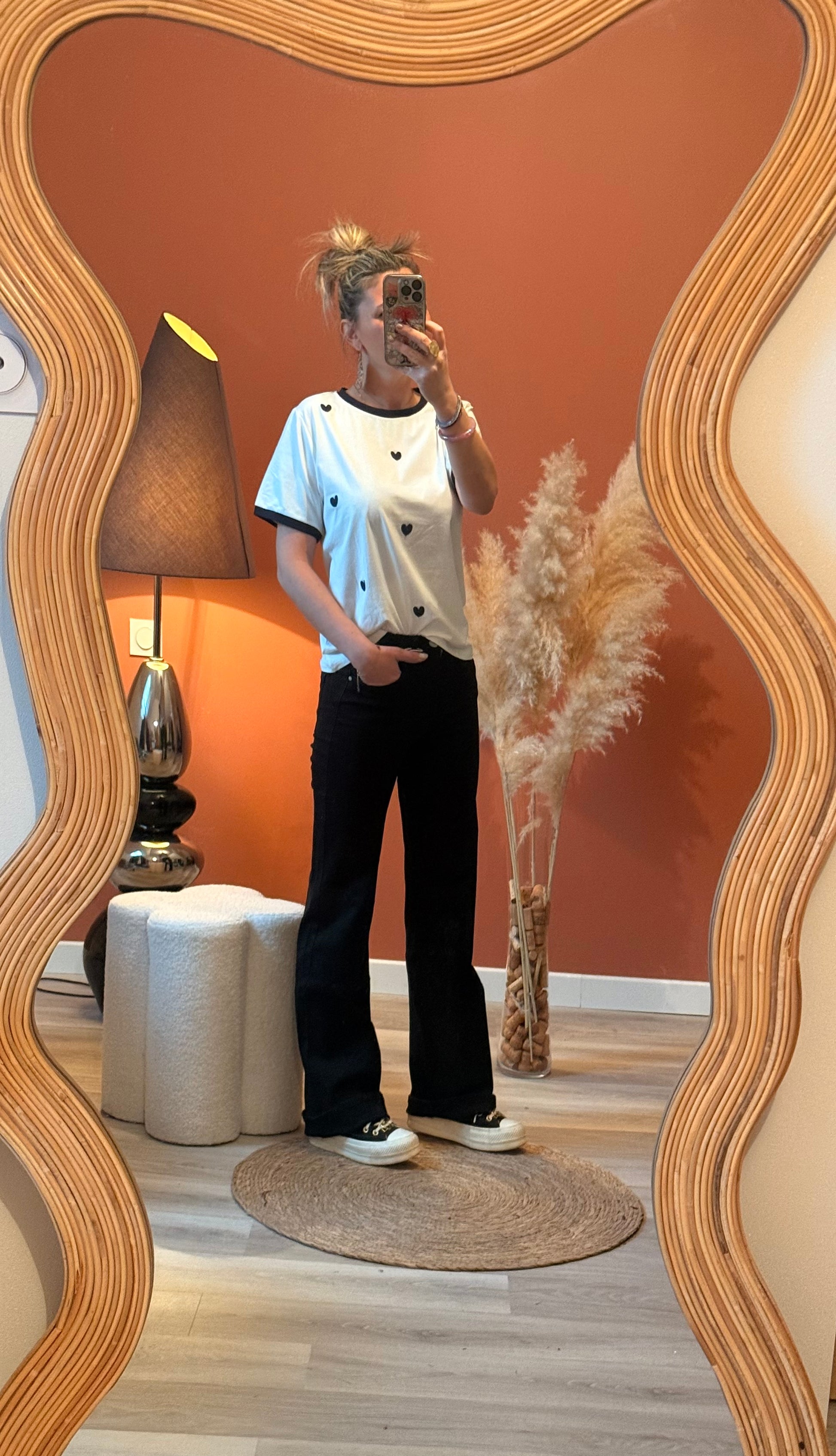 Tee-shirt blanc au design avec des cœurs noir brodé. Sa coupe confortable en fait une pièce facile à porter au quotidien, pour un look simple, chic et intemporel 🖤✨