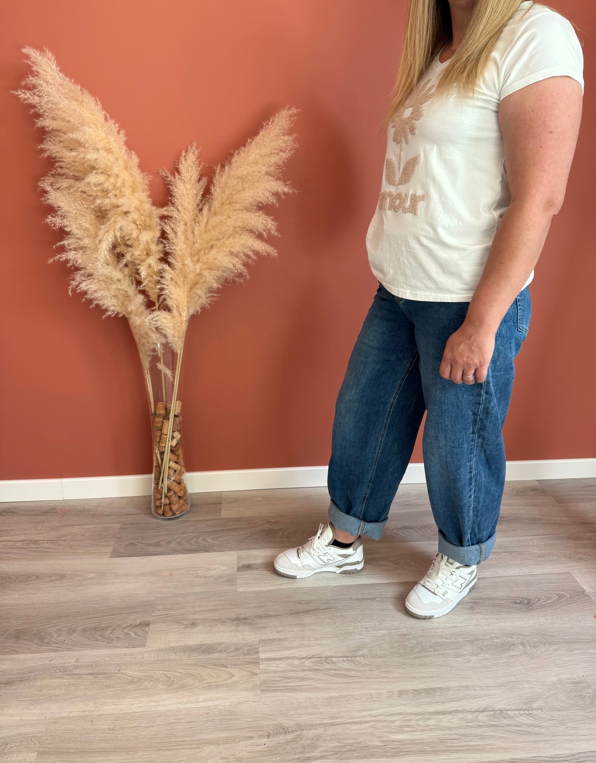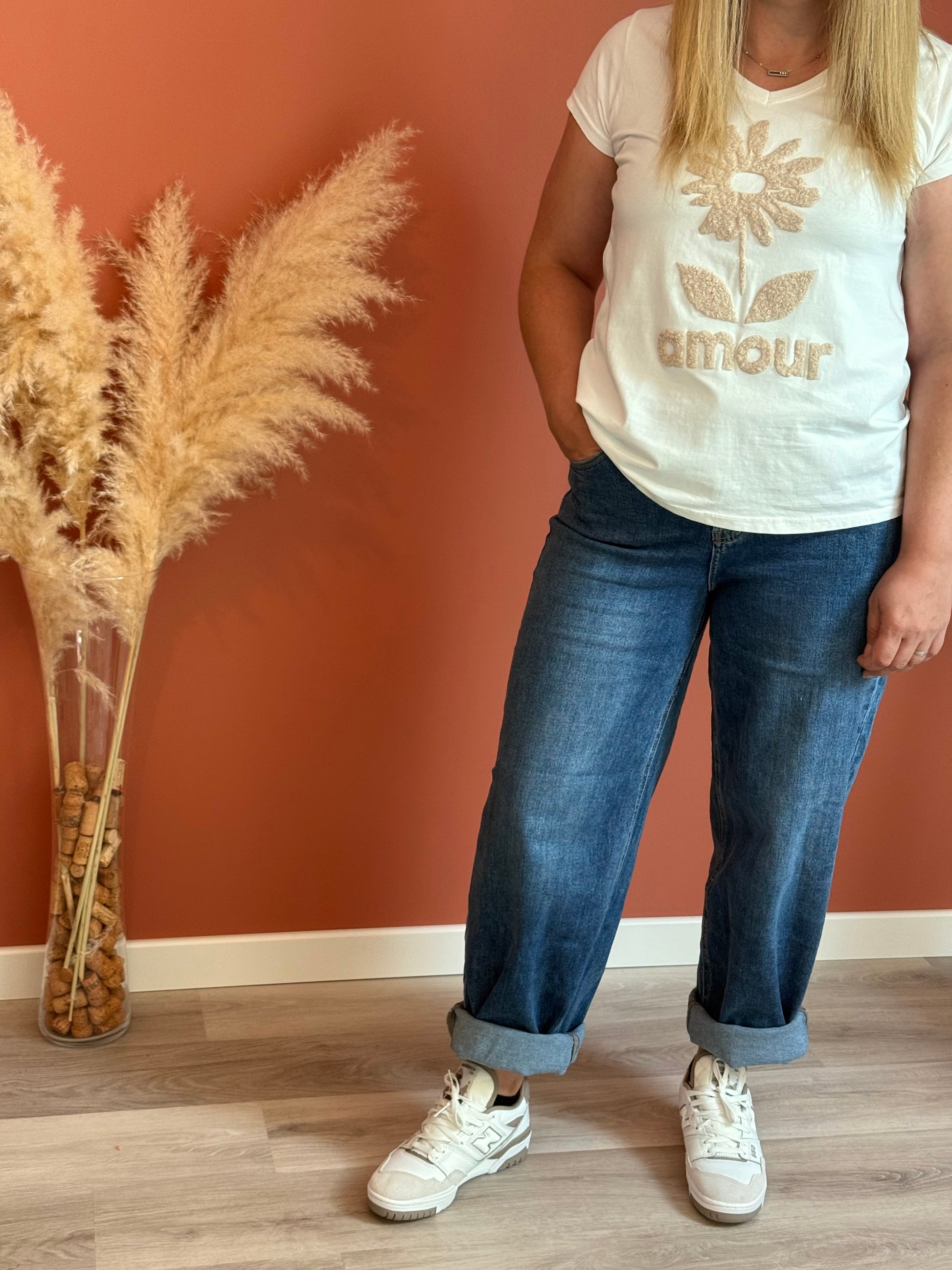 Adoptez un look casual chic avec ce tee-shirt  à la fois confortable et plein de charme. Avec un col V, sa fleur en moumoute met en-avant son charme aussi bien avec un jean, un short, une jupe, un jogging câest le tee shirt passe partout.Â